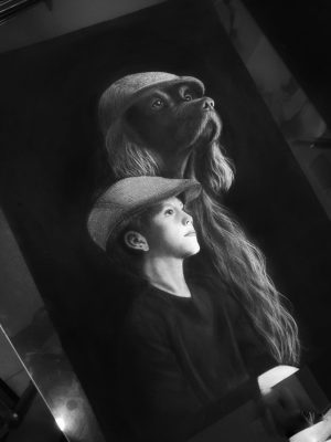 این نقاشی سیاه قلم پسر نوجوانی که در کنار سگش نشسته. کلاه و لباس پسر حس کلاسیک و روستایی اوایل قرن بیستم را تداعی می‌کند. هماهنگی نگاه و حالت آن ها٬ پیوند عمیق میان انسان و حیوان را به زیبایی در تصویر می‌شود دید.