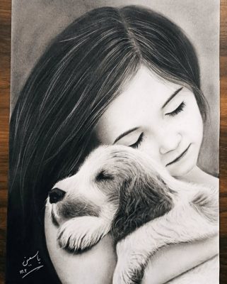 این نقاشی هم کودکی را نشان می‌دهد که با چشمان بسته توله‌سگی را در آغوش گرفته و لحظه‌ای آرام را تجربه می‌کند. ویژگی‌های چهره و موهایش حس یک دختر ایرانی از مناطق شمالی یا غربی کشور را تداعی می‌کند. ترکیب نگاه آرام و نوازش حیوان، صمیمیت و عشق بی‌قید و شرط را در تصویر می‌بینید.