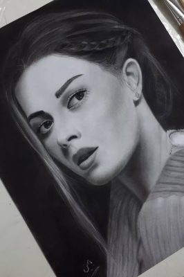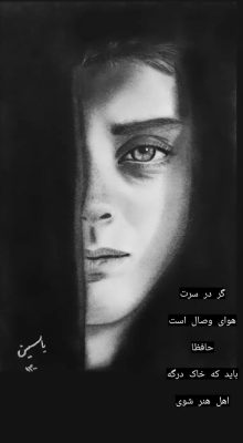 این سیاه قلم ترکیبی از تاریکی و روشنایی کشیده شده است. با نگاهی غمگین و چشمانی پر از حسرت.