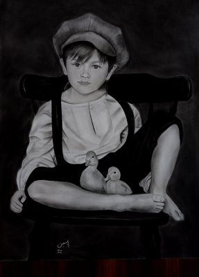 سیاه قلم یعنی با یک رنگ دنیایی از حس ها را زنده کنم… فقط با سیاهی می‌شود نور ساخت و جان به چهره ها داد. یک قلم ساده می‌تواند یک تصویر و زنده کند طوری که انگار نفس می‌کشد. این نقاشی را خیلی دوست دارم وقتی شروع کردم با عشق قلم می‌زدم. این تصویر یک کودک چهار پنج ساله است از گذشته های دور٬ دهکده ای در انگلستان